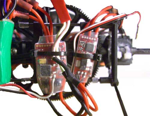 Using a brushless motor means using a separate gyro and a separate speed controller. If the Blade in question has been fitted with a brushless main motor as well we get to ditch the 3-in-1, a welcome weight savings to offset the additional weight of the gyro and second ESC. After removing the mixing board you can turn the receiver on its side. This will usually eliminate any glitching that has been occuring. The 10 gram brushless tail motor is controlled by a Turnigy Plush 10 amp ESC. Both the tail motor and main motors' ESC's are mounted below the main gear using the CF rods and an extra battery tray.