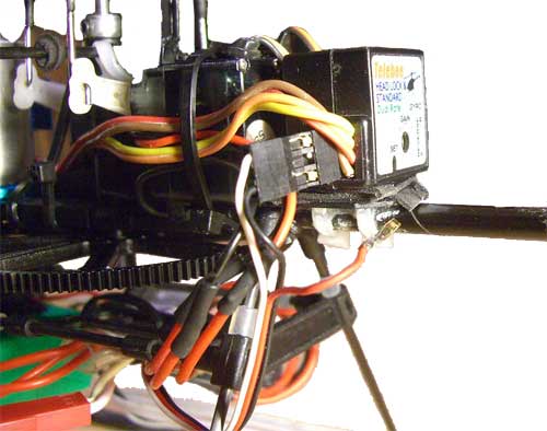 The signal from channel four of the E-flite receiver goes to the external gyro, in this case a Telebee 11 gram with heading hold. From the gyro the signal goes to the tail motor's ESC.